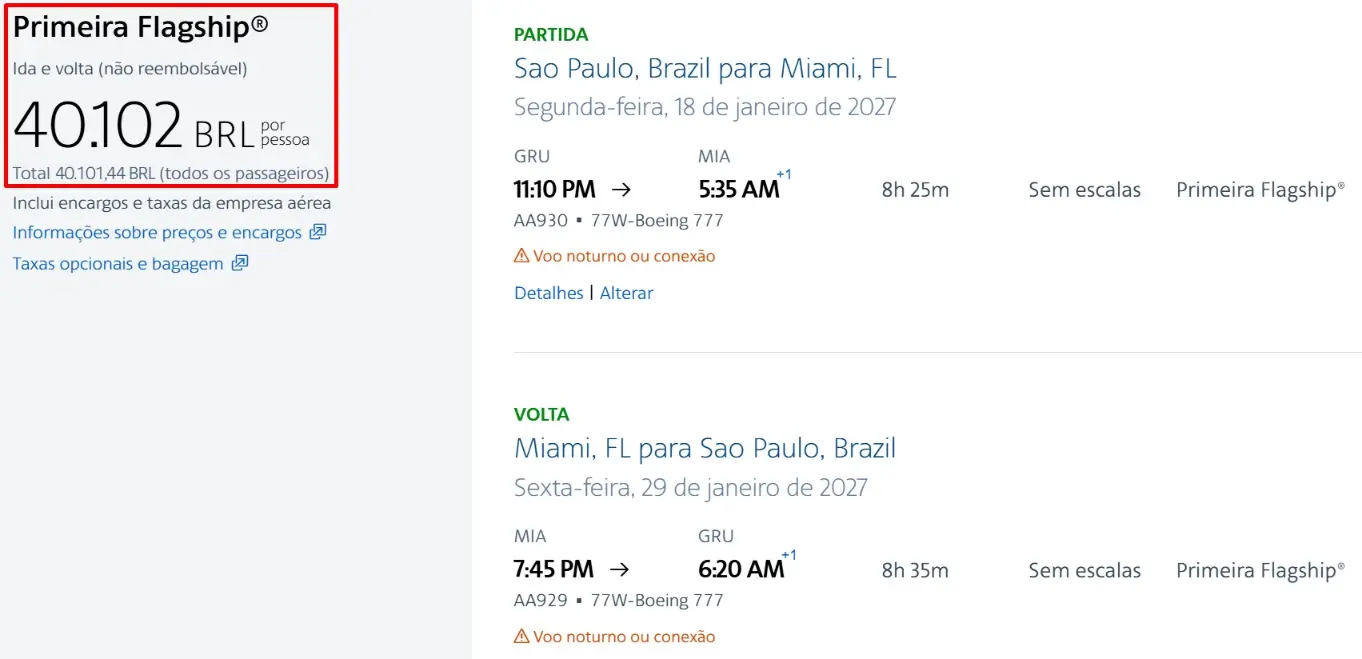 No AAdvantage essa passagem custa em torno de 165 mil milhas. Além de ser mais do que o dobro do preço, a geração de milhas AAdvantage custa o dobro do preço da geração de Avios.