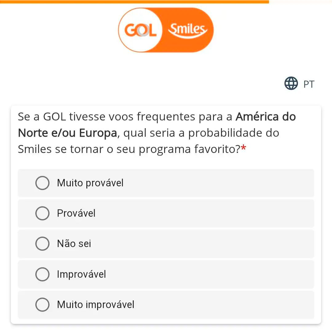 Clientes da GOL receberam um e-mail com uma pesquisa de mercado, que, numa das perguntas, questionava o passageiro: “Se a Gol tivesse voos frequentes para a América do Norte e/ou Europa, qual seria a probabilidade do Smiles se tornar o seu programa favorito?