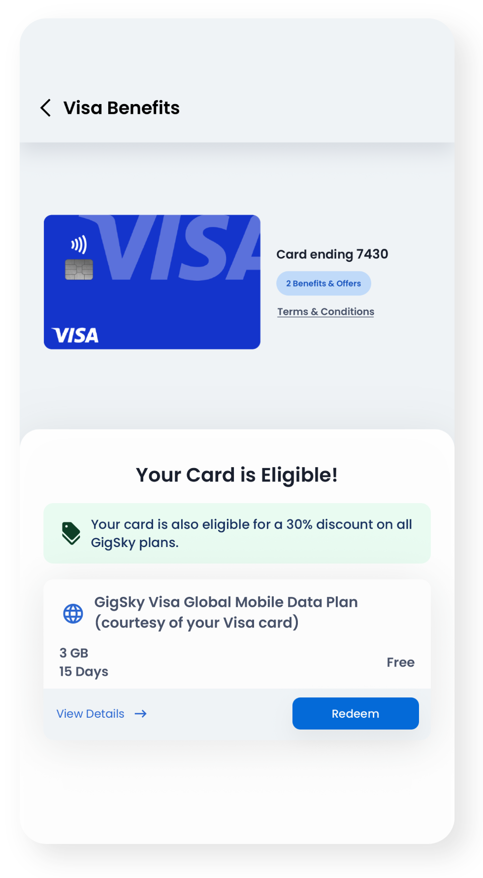 - Cartões Visa Signature e Visa Platinum elegíveis: 1 GB de dados globais por 15 dias;