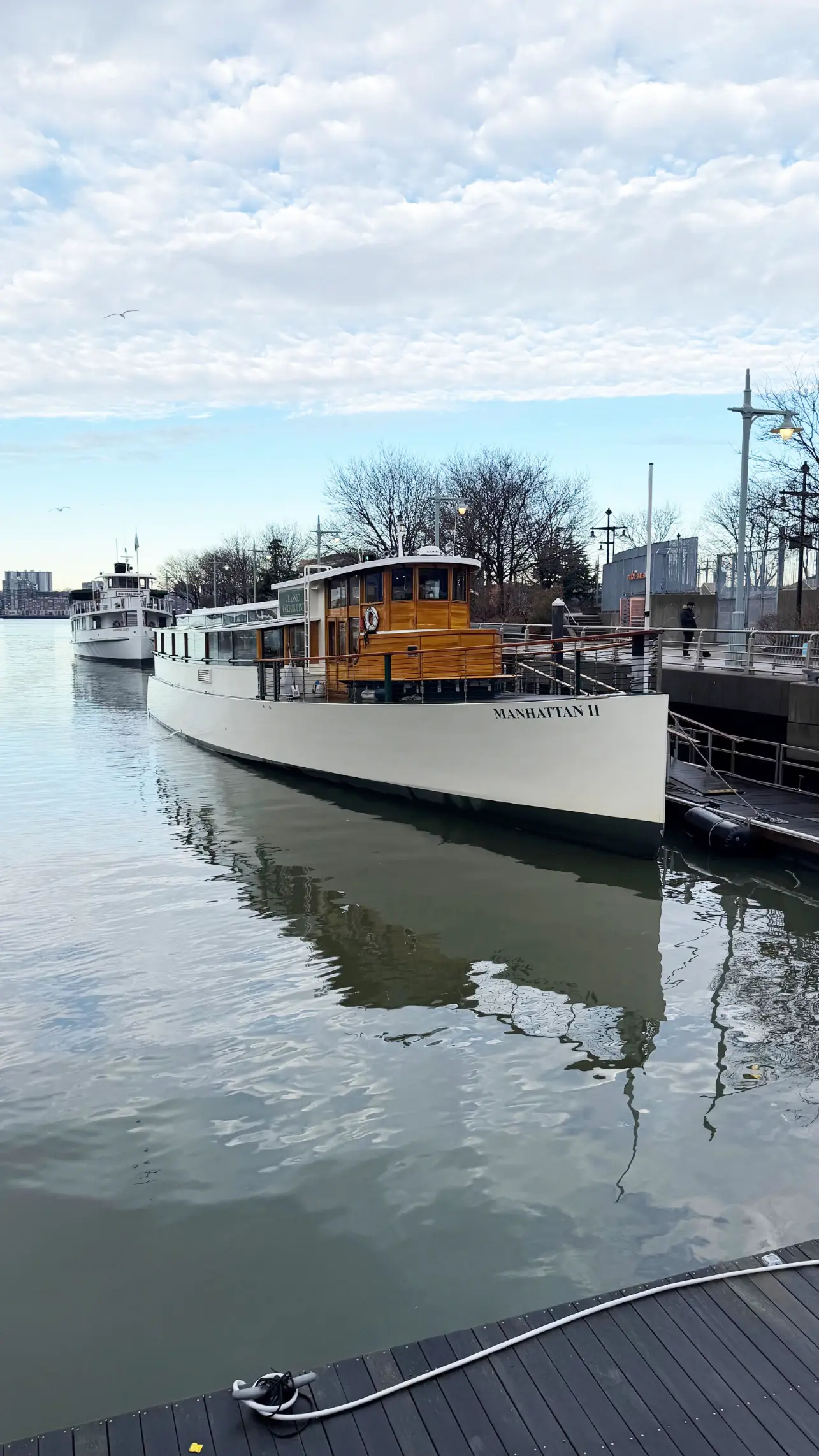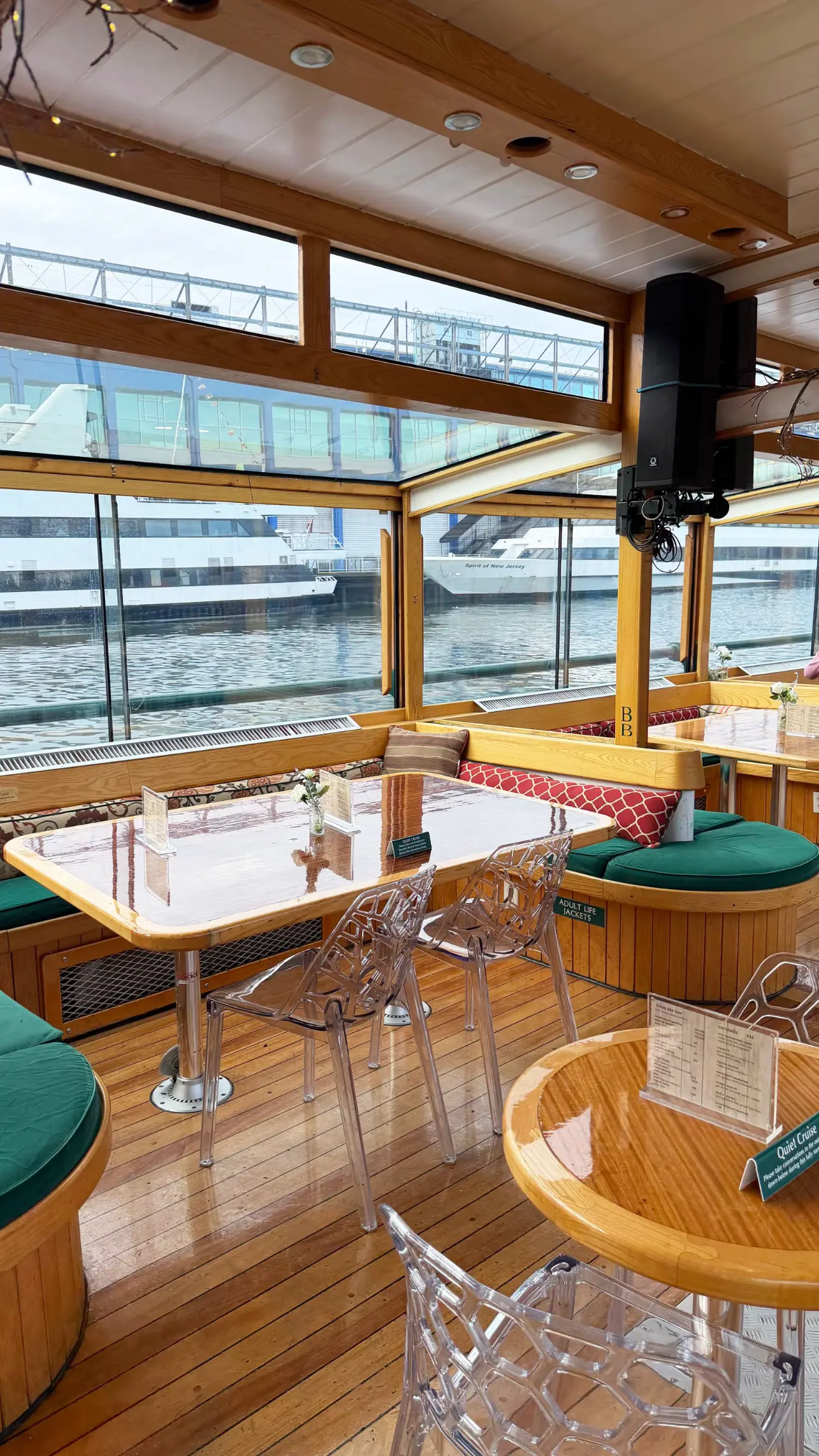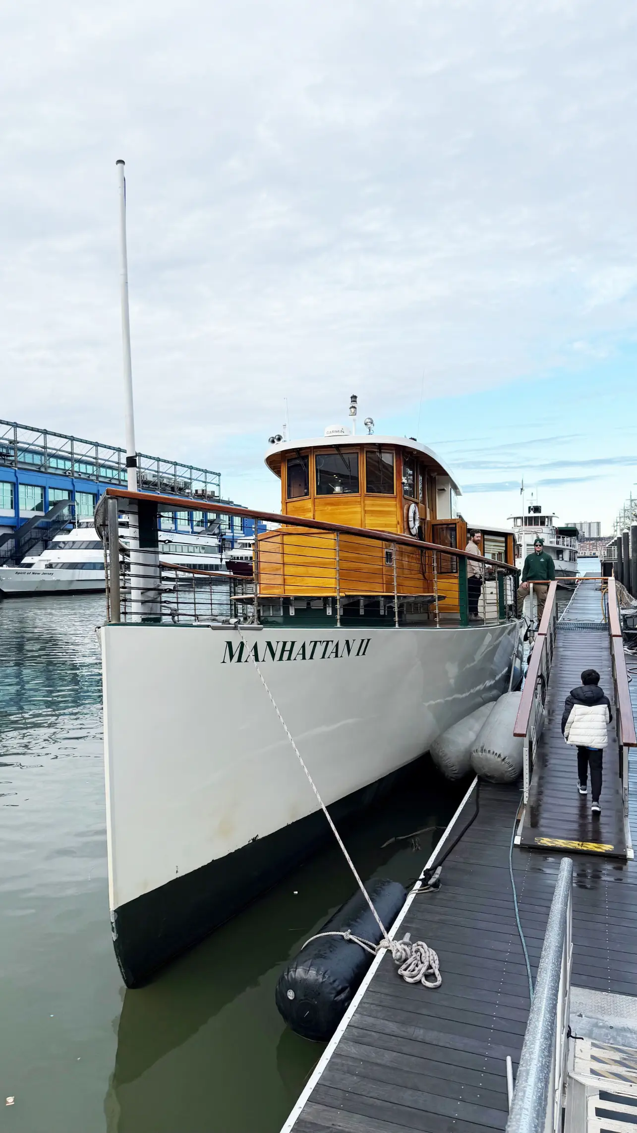 O passeio acontece a bordo do elegante iate Manhattan II, uma embarcação com design clássico inspirado nos anos 1920, toda envidraçada, aquecida e super aconchegante, perfeito para os dias frios de Nova York.