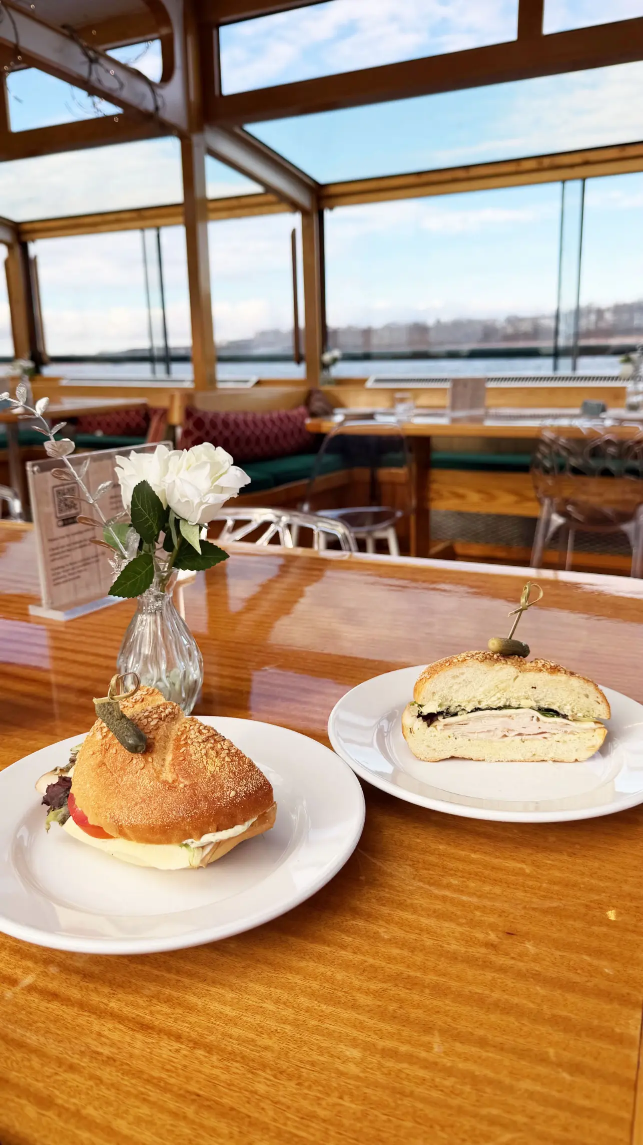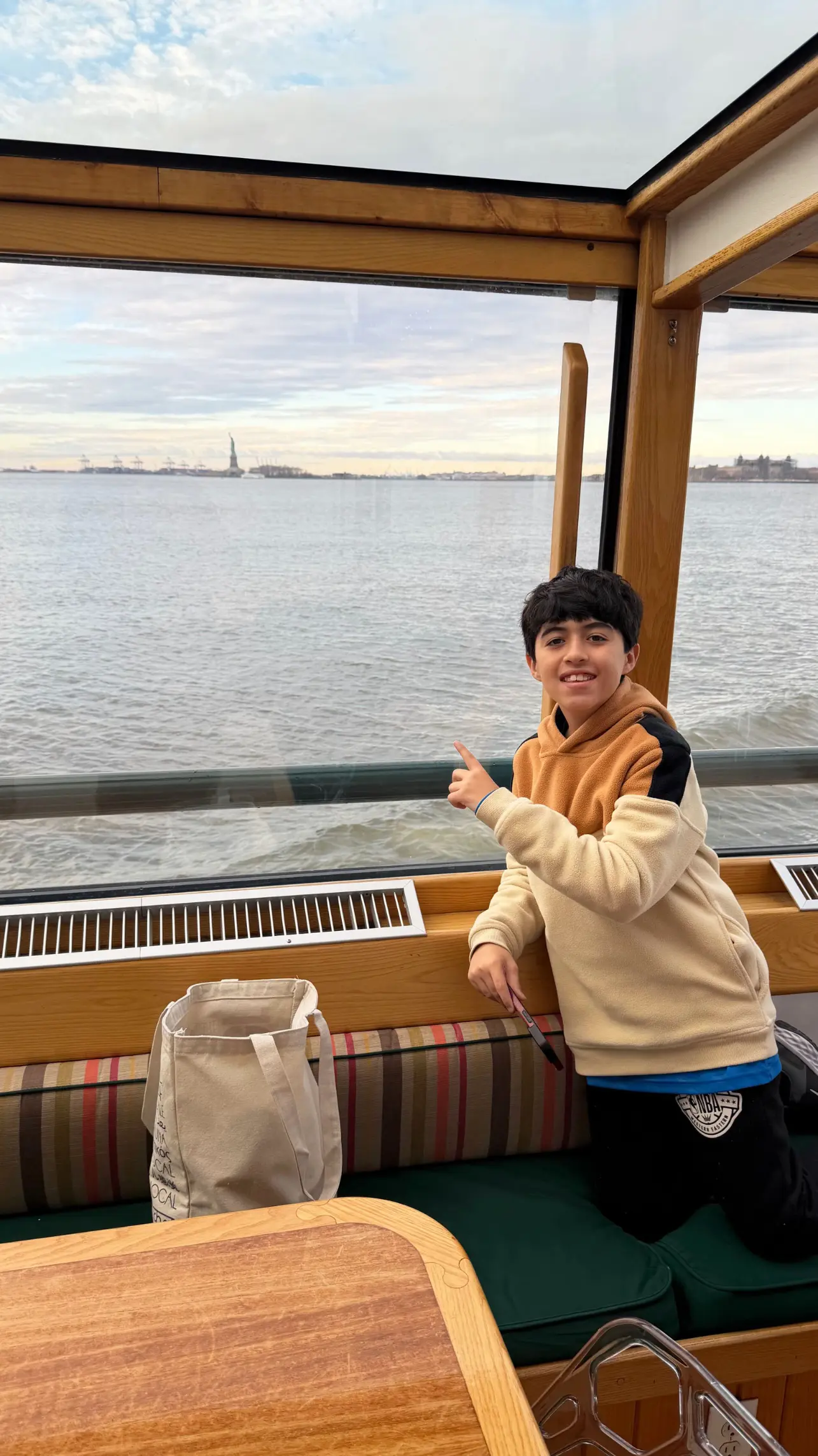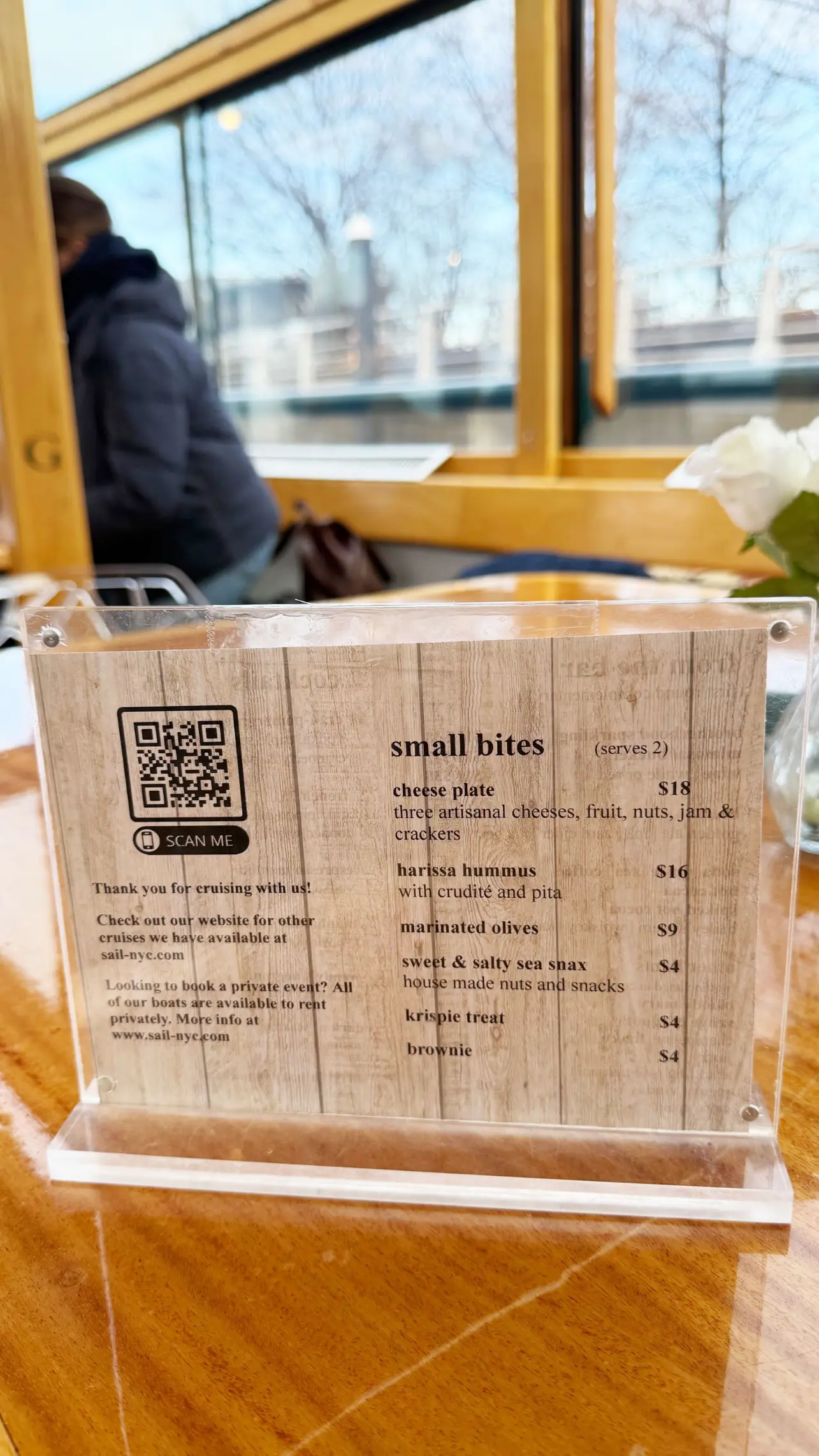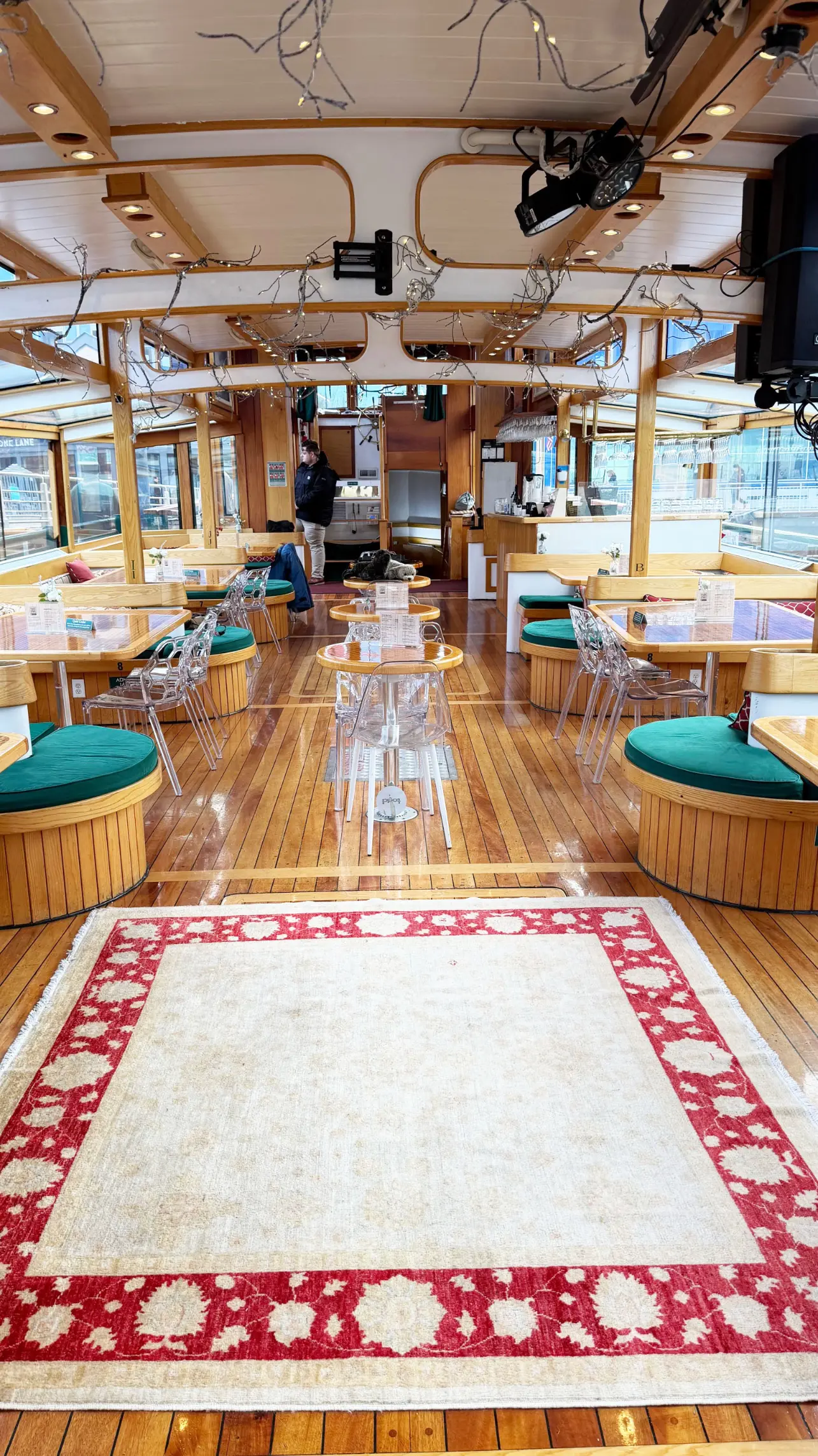 O passeio acontece a bordo do elegante iate Manhattan II, uma embarcação com design clássico inspirado nos anos 1920, toda envidraçada, aquecida e super aconchegante, perfeito para os dias frios de Nova York.