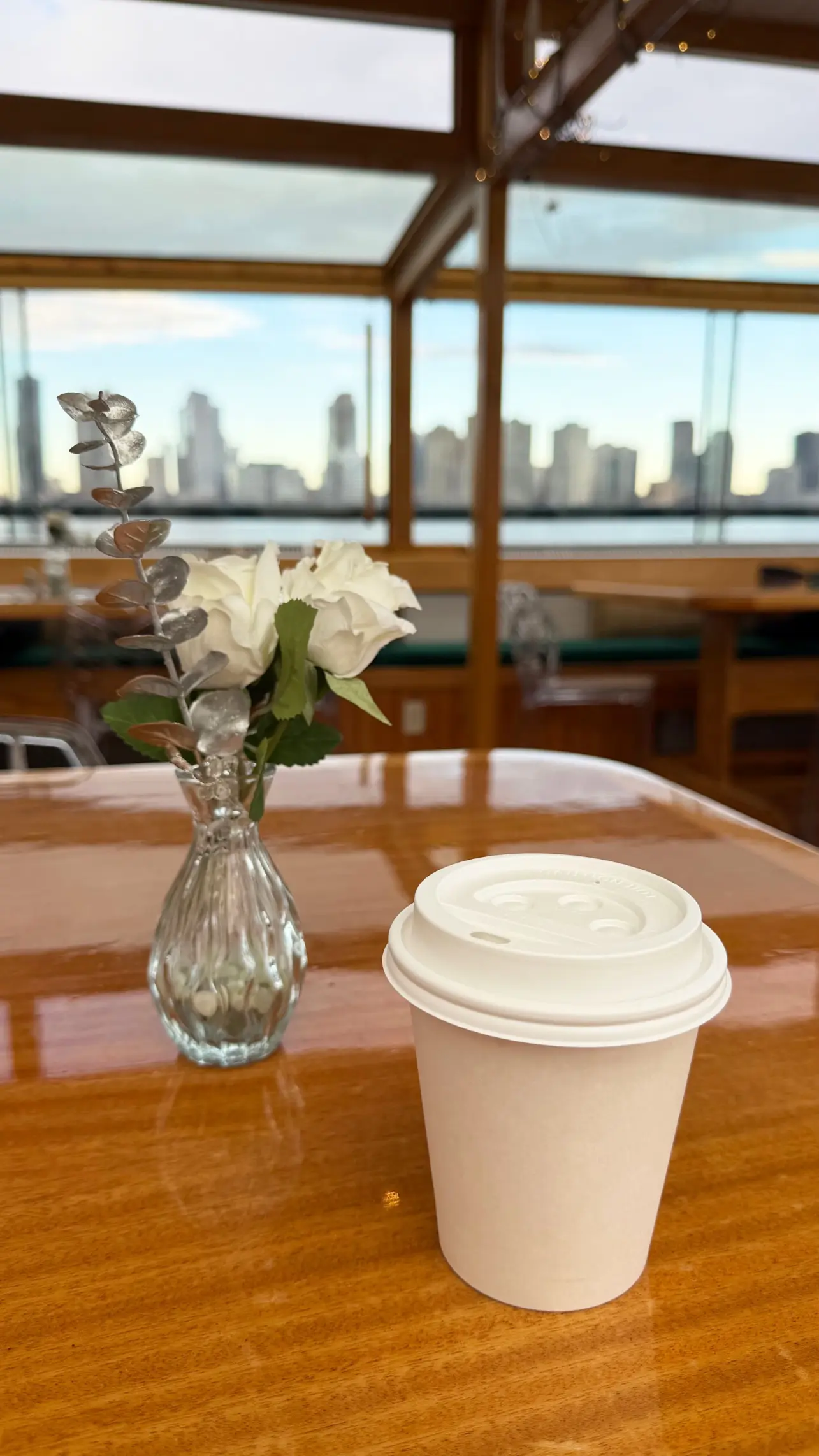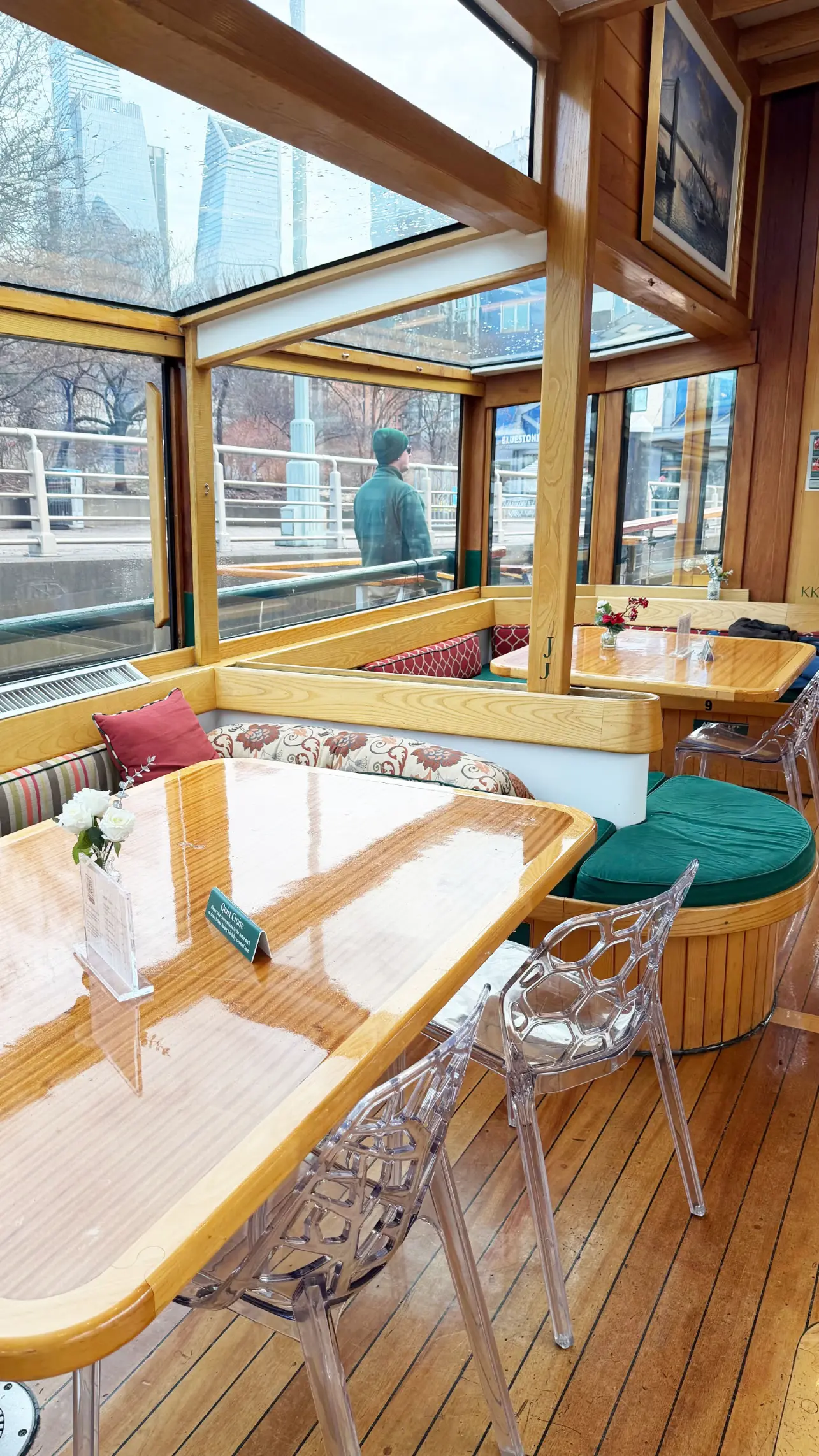 Logo ao embarcar, a tripulação indica as mesas marcadas. O interior climatizado garante conforto, mas há também área externa para quem quer sentir o vento gelado no rosto e tirar fotos incríveis do skyline.