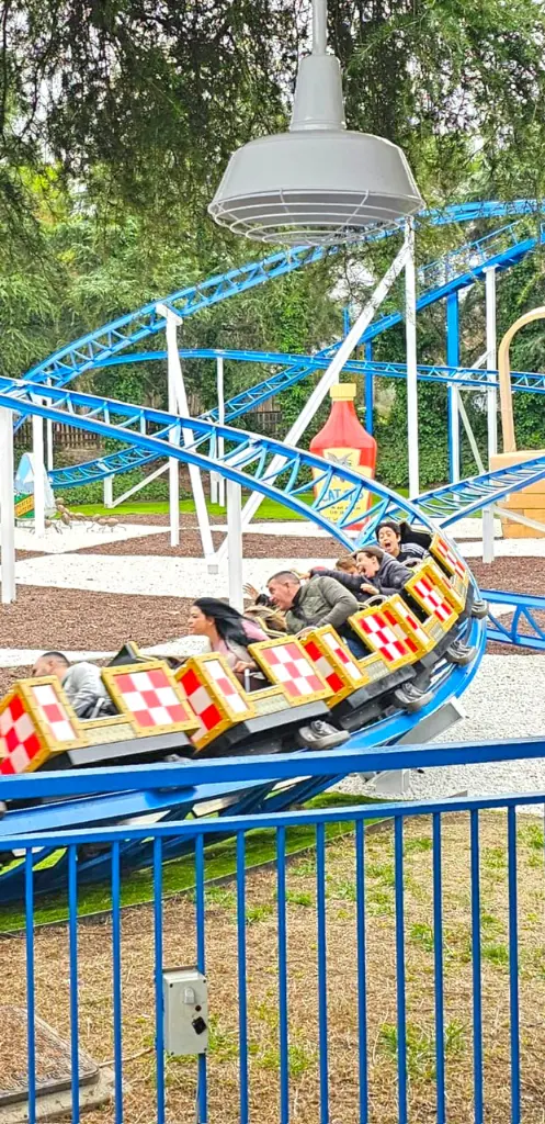 Percorra todo o piquenique nesta divertida montanha-russa familiar cheia de curvas. Você ainda vai atravessar um enorme copo de suco gigante pelo caminho!