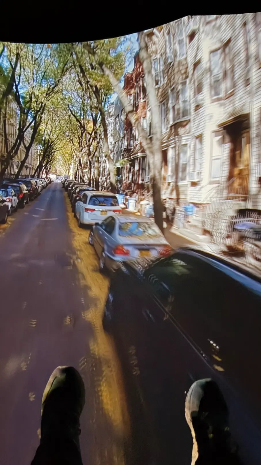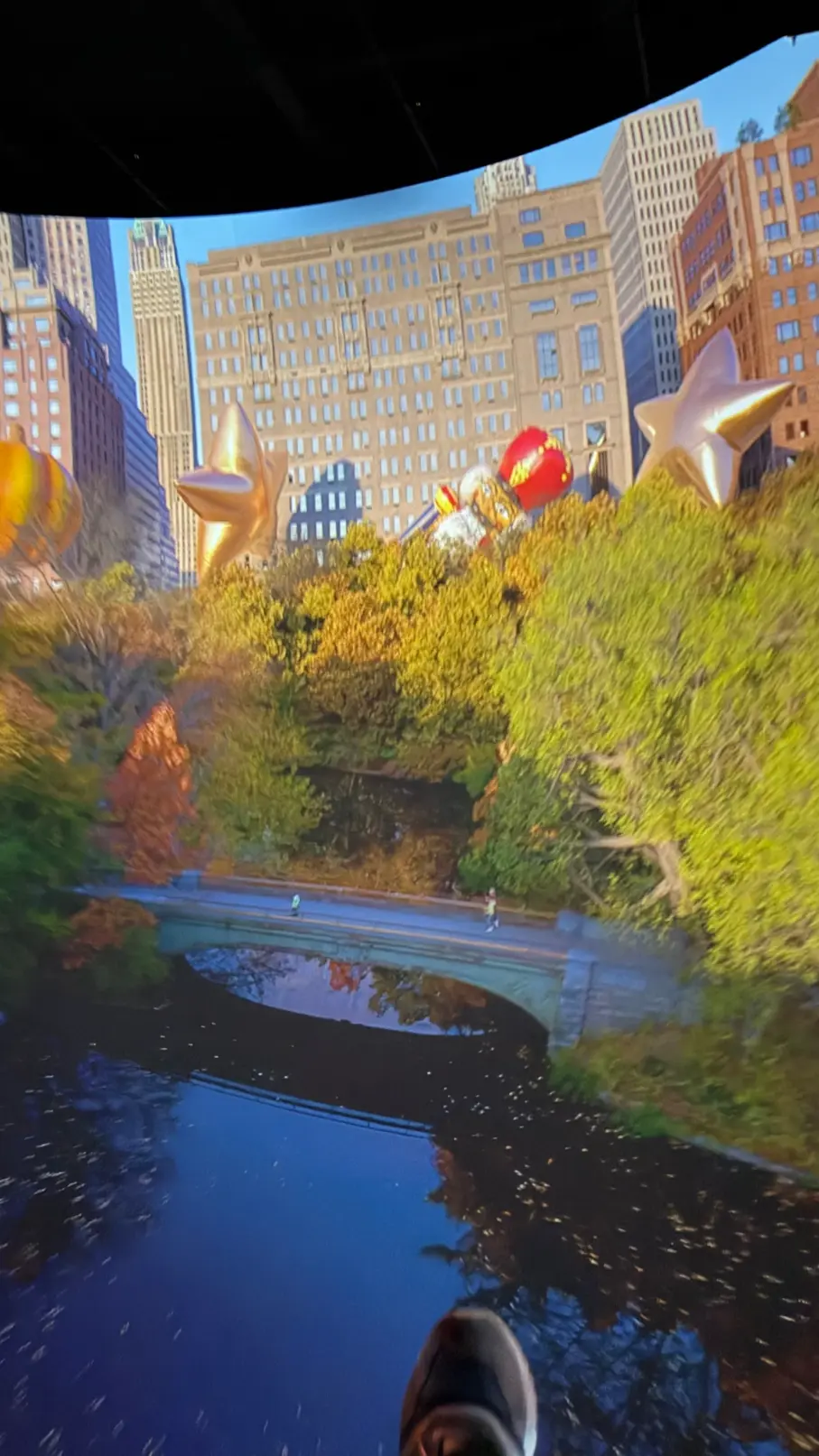 Aqui está o momento mais esperado. Você se senta em uma fileira de assentos suspensos, prende o cinto estilo avião e é elevado diante de uma enorme tela curva de 180 graus. A partir daí começa um sobrevoo virtual por Nova York ao longo das quatro estações do ano.