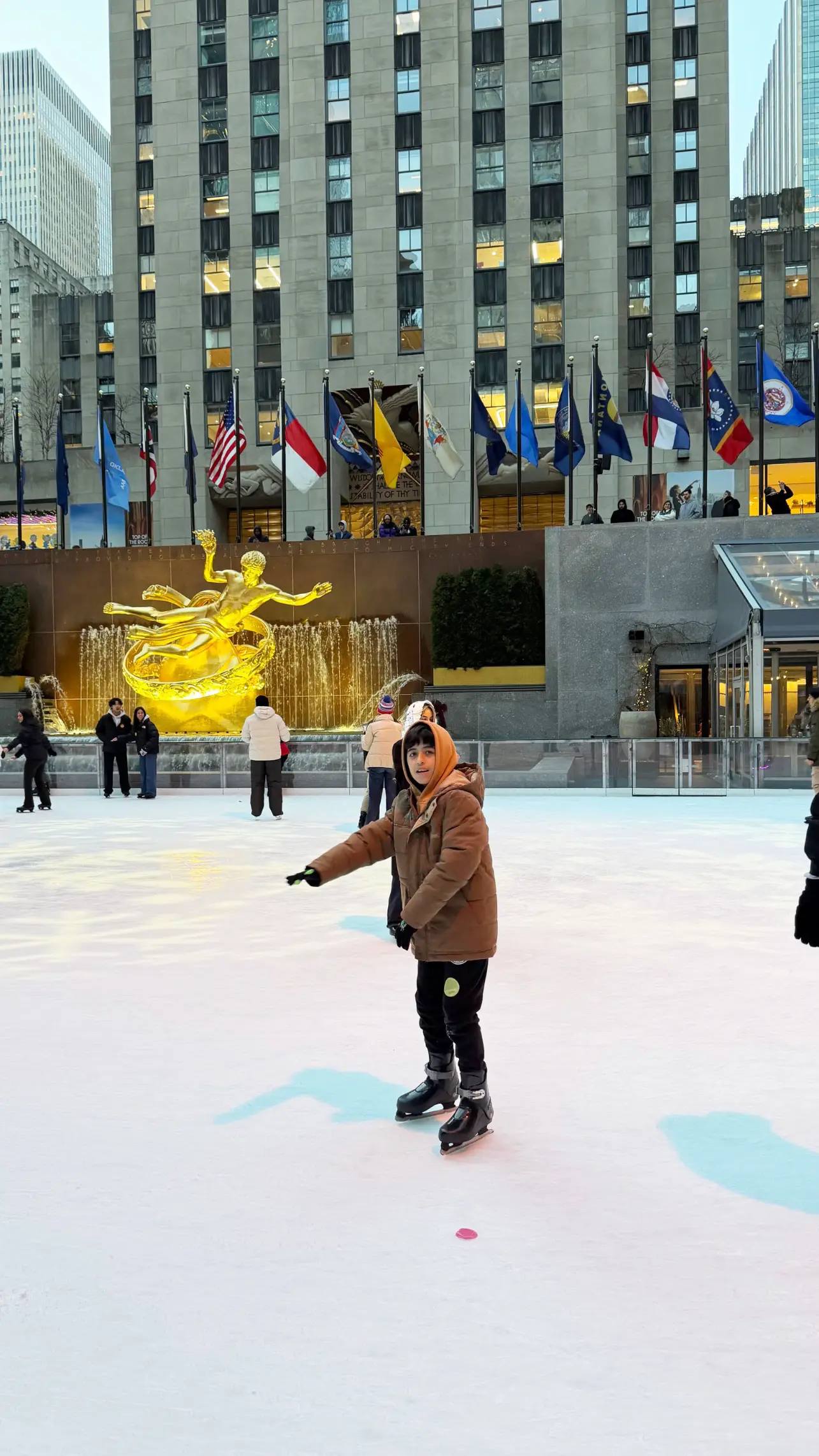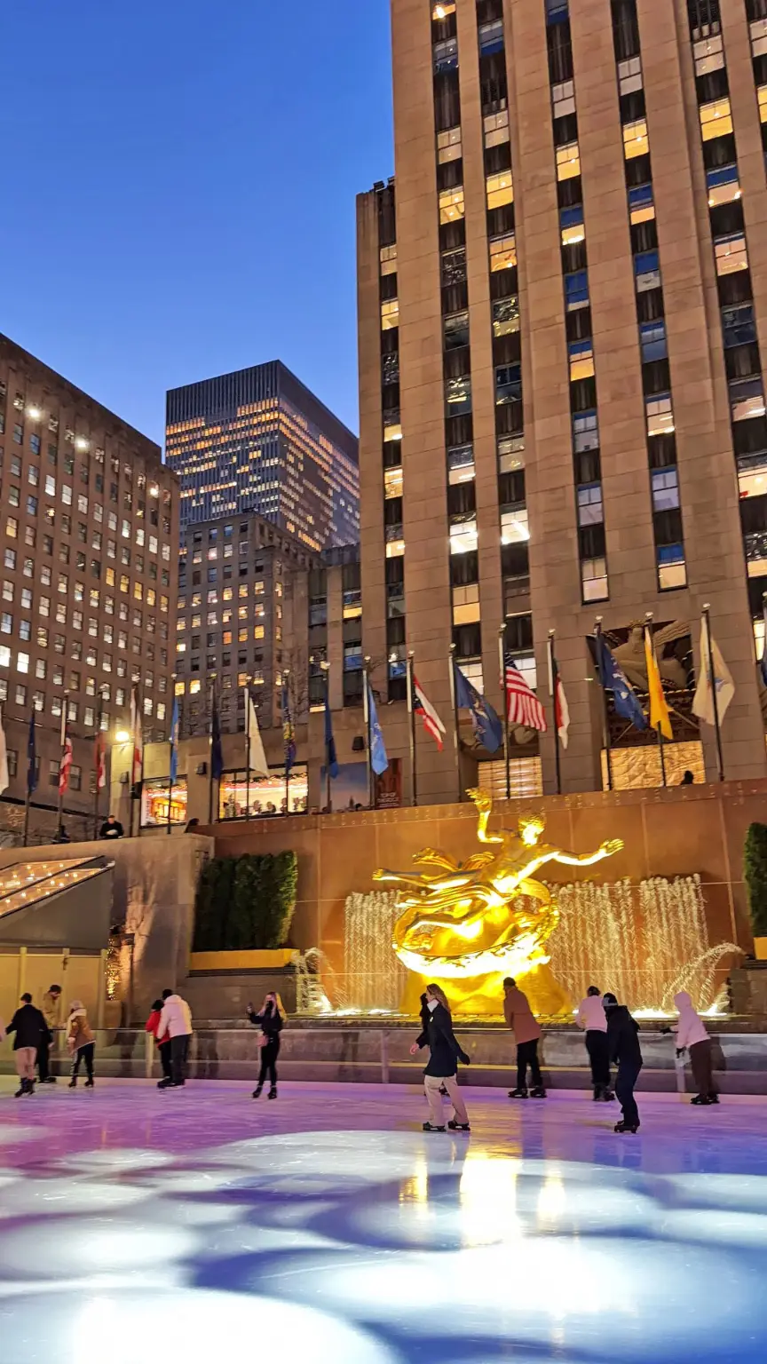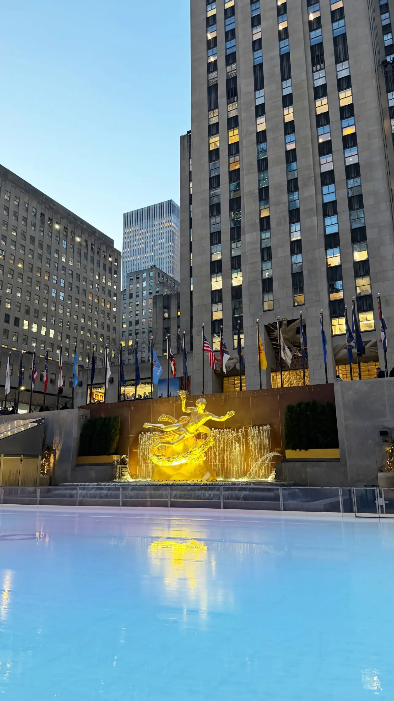 Aproveitamos para completar a experiência com a tradicional patinação no gelo. A pista do Rockefeller Center talvez seja a mais icônica da cidade. Patinar ali, com a escultura ao fundo e os prédios ao redor, é muito mais do que um simples momento fotogênico. O dourado Prometeu, criado por Paul Manship em 1934, não é apenas um dos símbolos mais reconhecíveis do Rockefeller Center, mas também uma poderosa alegoria do progresso humano.