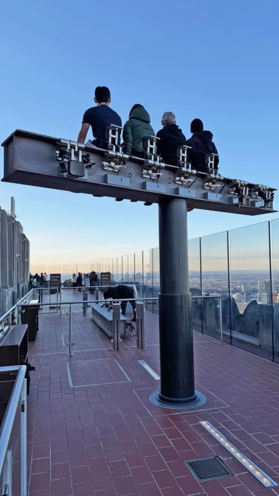 A proposta é simples e extremamente bem executada. Você se senta em uma viga metálica, preso por cintos de segurança, enquanto a estrutura se eleva cerca de 3,6 metros acima do terraço do 69º andar e gira lentamente para proporcionar vistas panorâmicas. A atração recria a famosa foto de 1932, Lunch atop a Skyscraper, tirada durante a construção do próprio Rockefeller Center.
